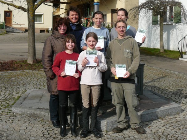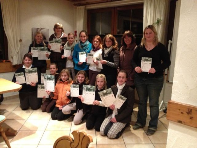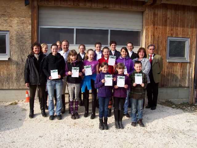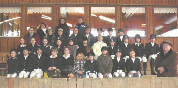 16 Teilnehmerinnen und Teilnehmer im Alter von 9 bis 44 Jahren wurden von Gabriele Walter in einem Lehrgang in Praxis und Theorie unterrichtet und intensiv vorbereitet für die Basispassprüfung am 12.03.2010. Sie stellte zusammen mit einer Teilnehmerin ihre gut ausgebildeten Pferde/Pony zur Verfügung.